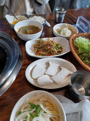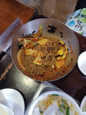 맛은 생각하는 그맛 그대로입니다. 기본 반찬 이외에 추가 반찬은 셀프코너에서 가져다 먹으면 됩니다. 종업원 일일이 불러서 더 주세요 안해도 되서 편했습니다. 막국수는 먹던걸 찍어서 조금 지저분해 보이지만 얘도 예상한 맛 그대로입니다.