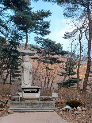 정문 앞의 화장실 건물 주변에 차를 주차하면 됩니다. 정문을 통과해서 완만한 오르막길을 조금 오르다보면 석상이 하나 나타납니다.