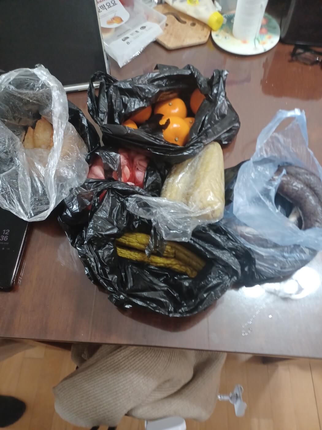 순대, 오이지, 마늘, 땡이네 튀김만두, 옥수수, 천혜향 등등 반찬거리는 거의 없고 죄다 간식이네요.